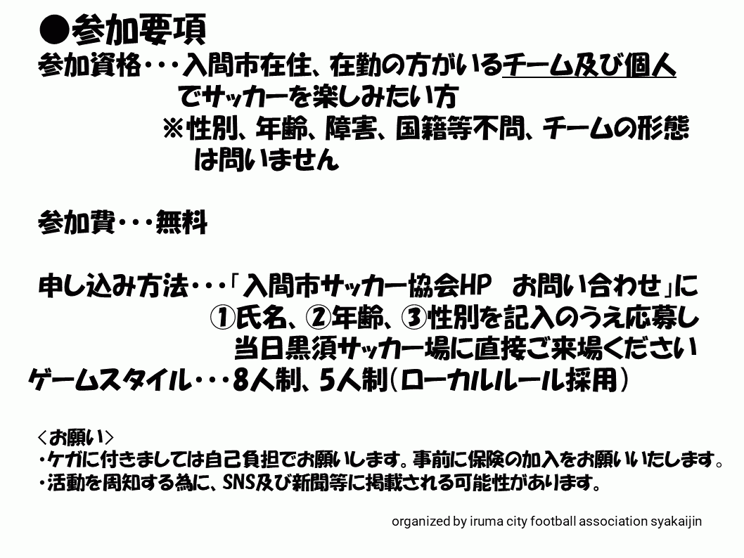 出場資格・・・入間市在住、在勤の方がいるチームでサッカーを楽しみたい方はどなたでも ※性別、年齢、障害、国籍等不問、チームの形態は問いません